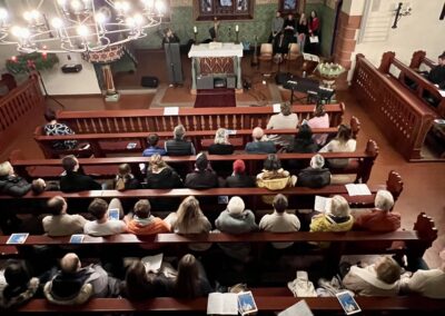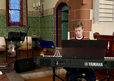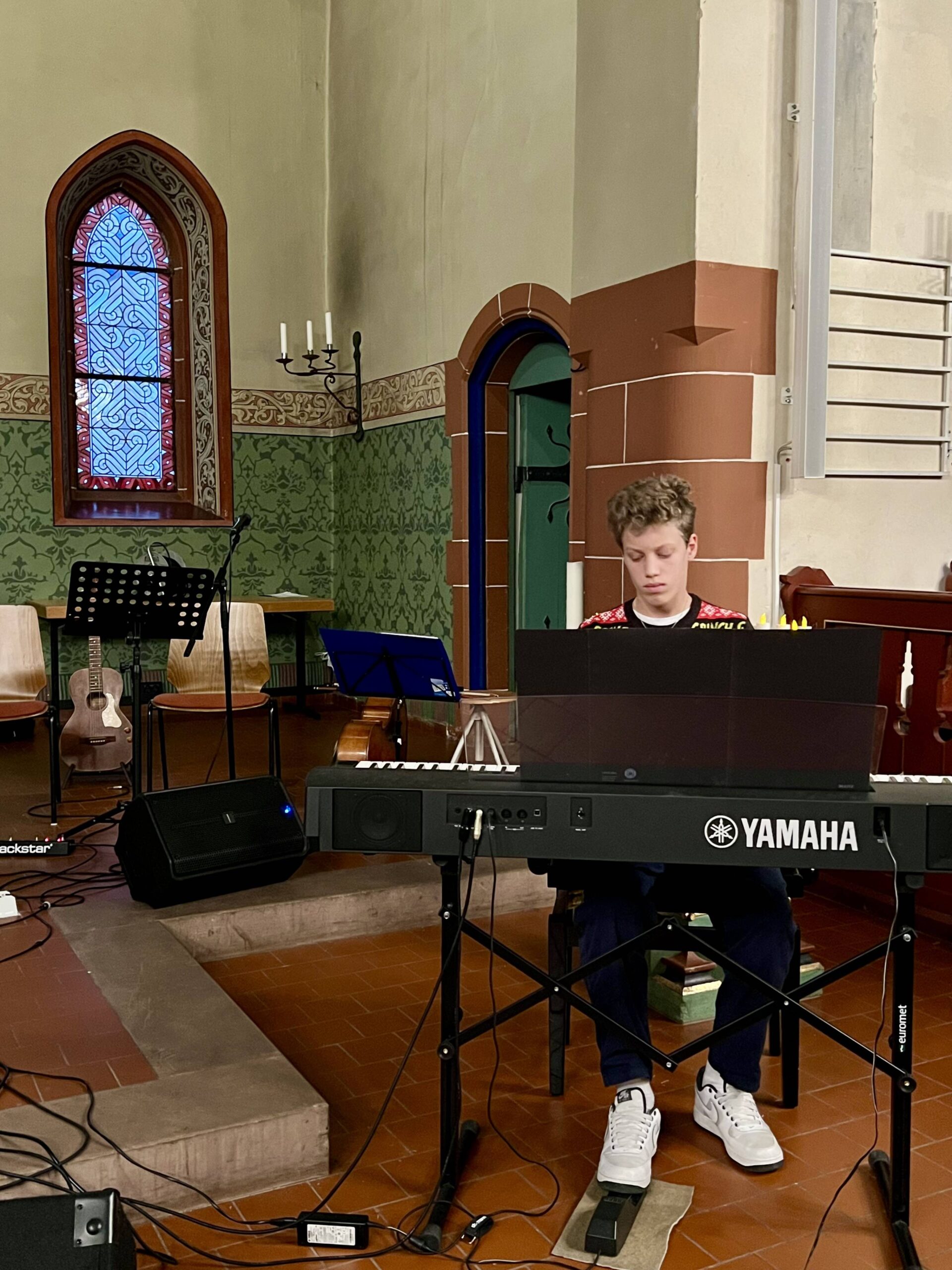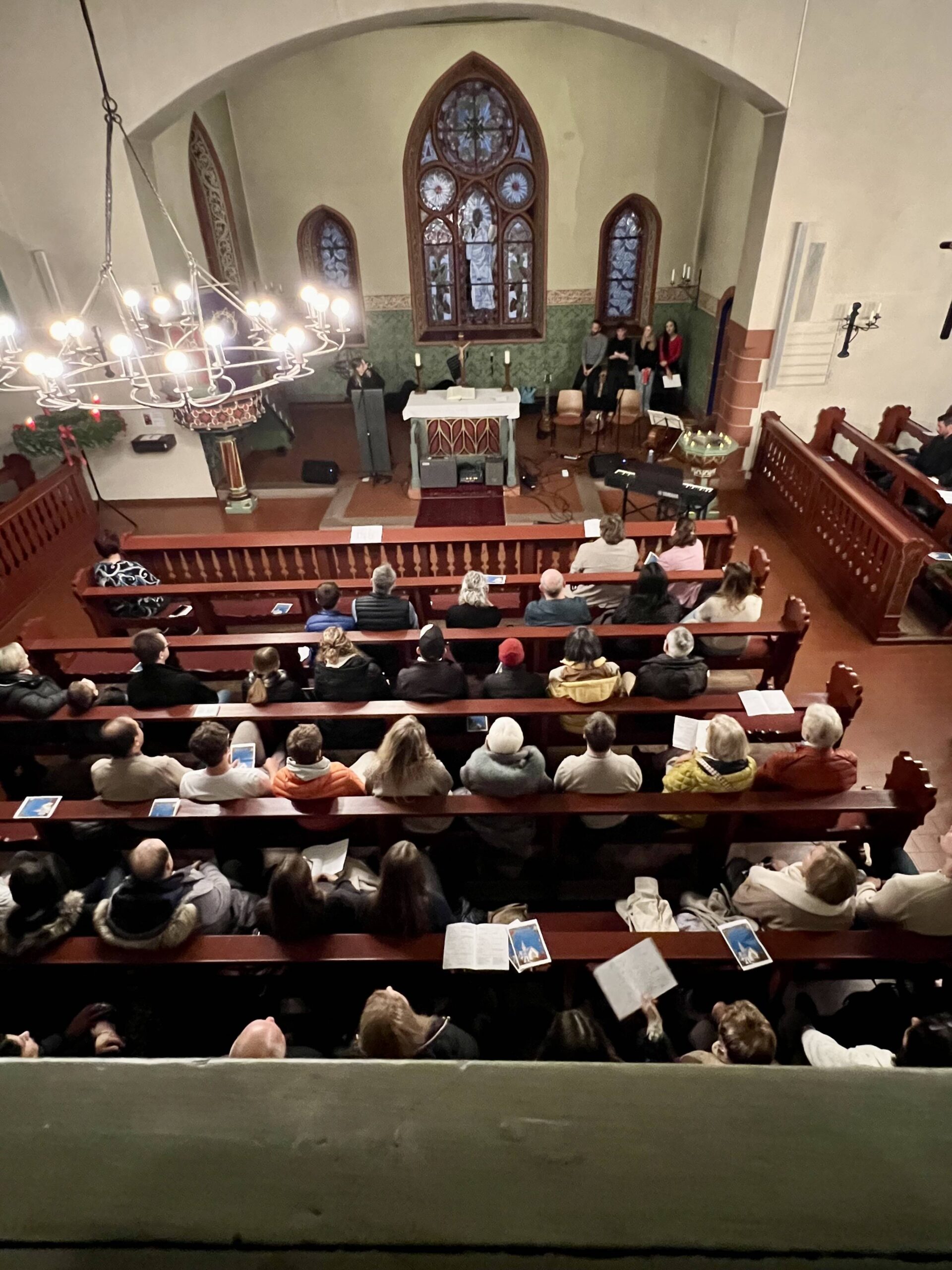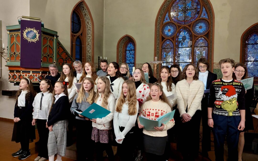 Besondere Akzente setzten die Beiträge des Lehrerchors, der unter der Leitung von Anna Lochner unter anderem das deutsche Weihnachtslied „Sind die Lichter angezündet“ sowie das anspruchsvolle Werk „In the stillness“ eindrucksvoll darbot. Ein weiterer Höhepunkt war die eigene Komposition von Leander Kunzmann, der so nicht nur in der Chor-AG, sondern auch als Solist in Erscheinung trat. Gemeinsam mit Daniel Schnabel, der die Cellosuite No. 2 von Johann Sebastian Bach zum Besten gab, sorgte er für einen stillen, fast meditativen Moment, der den Kirchenraum mit großer Tiefe erfüllte.