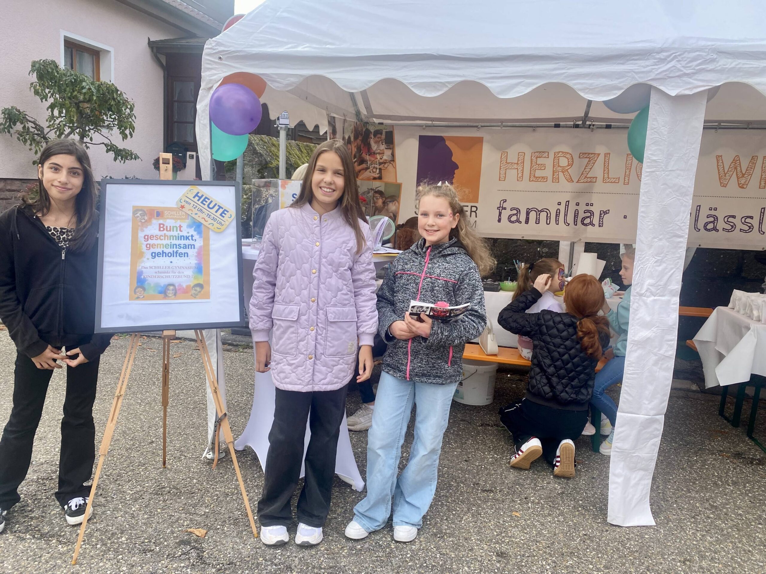 Bereits im September beteiligte sich das Schiller-Gymnasium Pforzheim mit einem eigenen Stand am Stadtteilfest Büchenbronn. Unter dem Motto „Kreativ sein und Gutes tun“ boten Schülerinnen und Schüler dort mit großem Engagement Kinderschminken an. Die Idee entstand aus dem Wunsch der Schülerinnen und Schüler, mit einer gemeinsamen, kreativen Aktion Spenden für den Kinderschutzbund Pforzheim Enzkreis e.V. zu sammeln. Mit viel Freude, Farbe und Fantasie verwandelten sie zahlreiche Gesichter in kleine Kunstwerke – und erzielten dabei einen Erlös von 200 Euro. Die Schülerinnen und Schüler überreichten gemeinsam mit ihrer Kunstpädagogin Tanja Schissler-Schein den symbolischen Scheck an Birgit Metzbaur, die Vorsitzende des Kinderschutzbundes Pforzheim Enzkreis e.V. Für die Kinder war es ein besonders wertvoller Moment: Sie sahen, an wen ihre Spende geht, und spürten, wie viel Gutes eine kreative Idee bewirken kann. In dem anschließenden Gespräch mit Birgit Metzbaur entstanden zudem erste Ideen für weitere kreative Aktionen, mit denen die Schülerinnen und Schüler den Kinderschutzbund künftig unterstützen könnten.