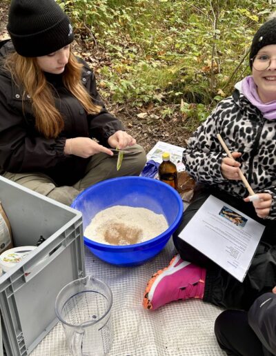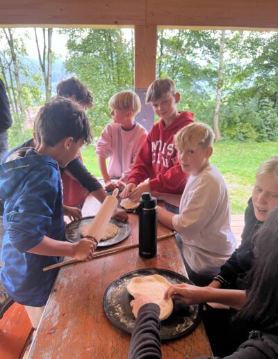 Der Premiumstockbrotteig wurde so kraftvoll geknetet, geschlagen und liebevoll gewärmt, dass ein Outdoormichelinstern dafür vergeben werden kann. Vor dem Genuss dieser Delikatesse mussten jedoch im Totholz geeignete Stöcke gefunden und auch zugerichtet werden. Natürlich geht das nur mit einem scharfen Taschenmesser. Daher folgte von den Teamern nun der Schnitzeinweisungskurs mit dem wichtigsten Leitspruch: „Nur im Sitzen darf man schnitzen!“ Resultat: Der Brotteig blieb unblutig, es gab nur zwei, drei leichte “Hautritzer“, die jedoch niemandem vom Schnitzen abhalten konnten.