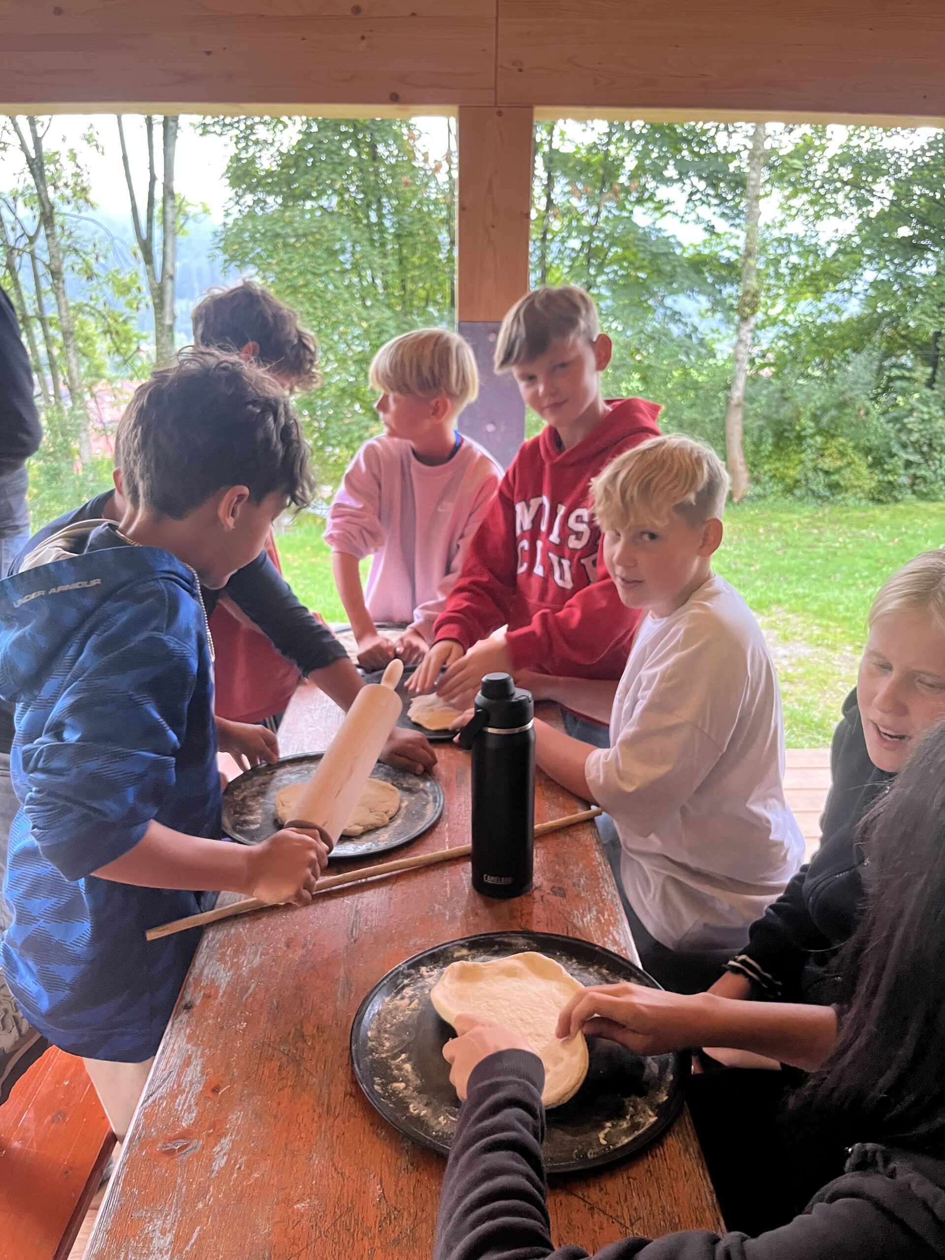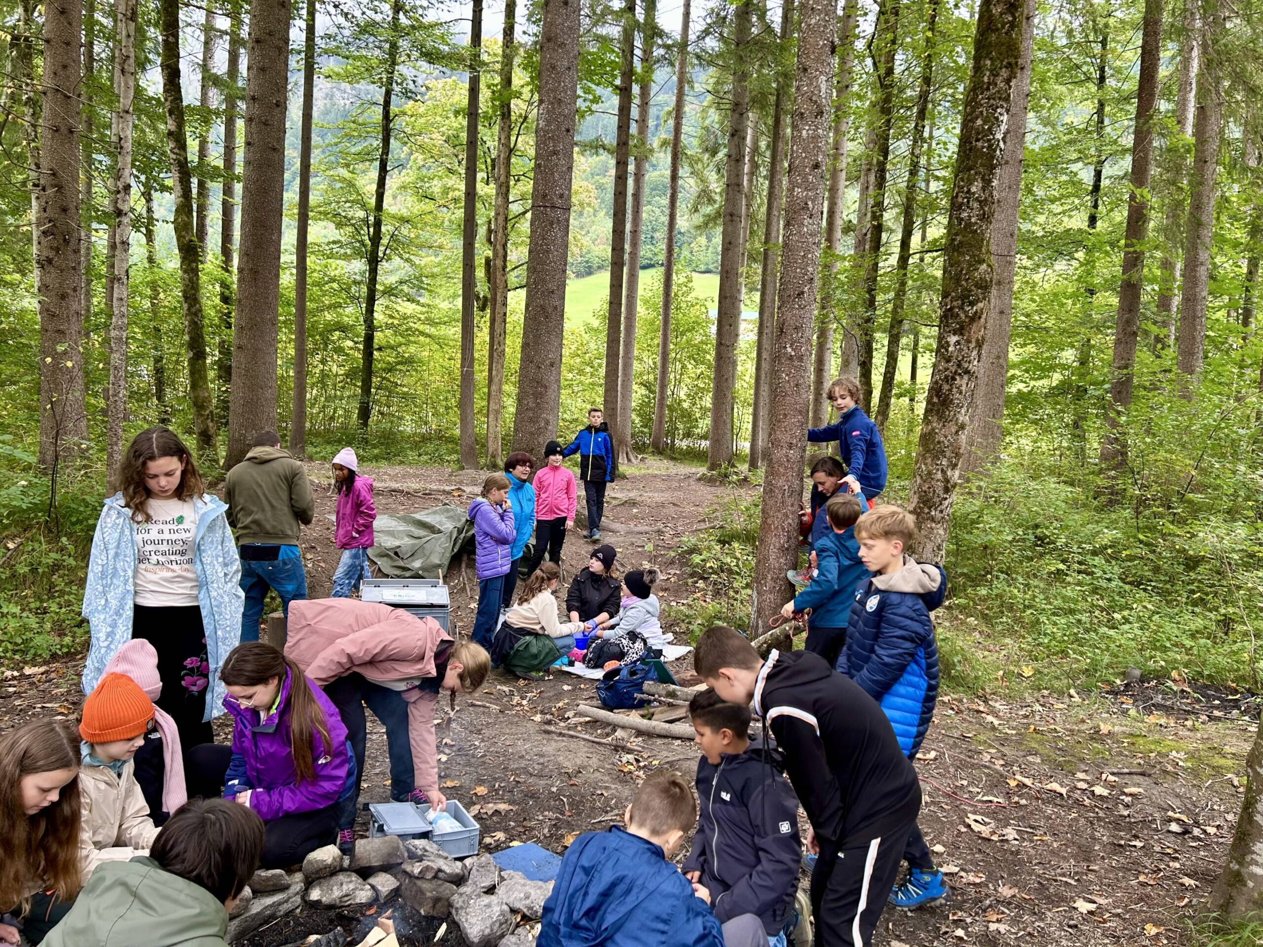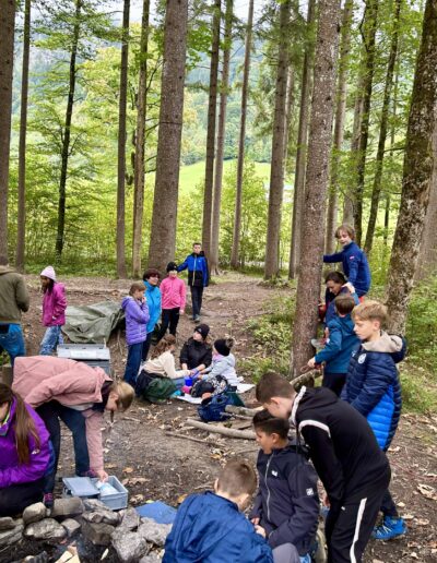 Der nächste Tag. Und schon scheint er zu wirken, der JUBI-Zauber. Die Besprechungskreise sind ruck-zuck fertig, alle können zuhören, haben sich einvernehmlich in Kleingruppen aufgeteilt und sind motiviert, ihre Teamaufgabe für die „Wilde Küche“ zu erfüllen. Mit beladenem Materialwagen rollen wir zur Grillstelle im Wald an die wilde Ostrach. Nach dem vielen Regen ist unsere leicht abfallende Uferseite doch ordentlich umströmt. Daher gibt es zunächst ein Absperrseil, über das niemand hinausgehen darf, zunächst! Die Packgruppe und die Wagenziehgruppe haben perfekte Arbeit geleistet, so kann die Tarp-Gruppe, die nun einen Unterstand baut, die Feueranmachgruppe und die Brotteiggruppe an den Start gehen. Heute wird einander geholfen, ruhig geplaudert und es entsteht ein richtiger „Naturflow“, alle sind entspannt und fühlen sich wohl.