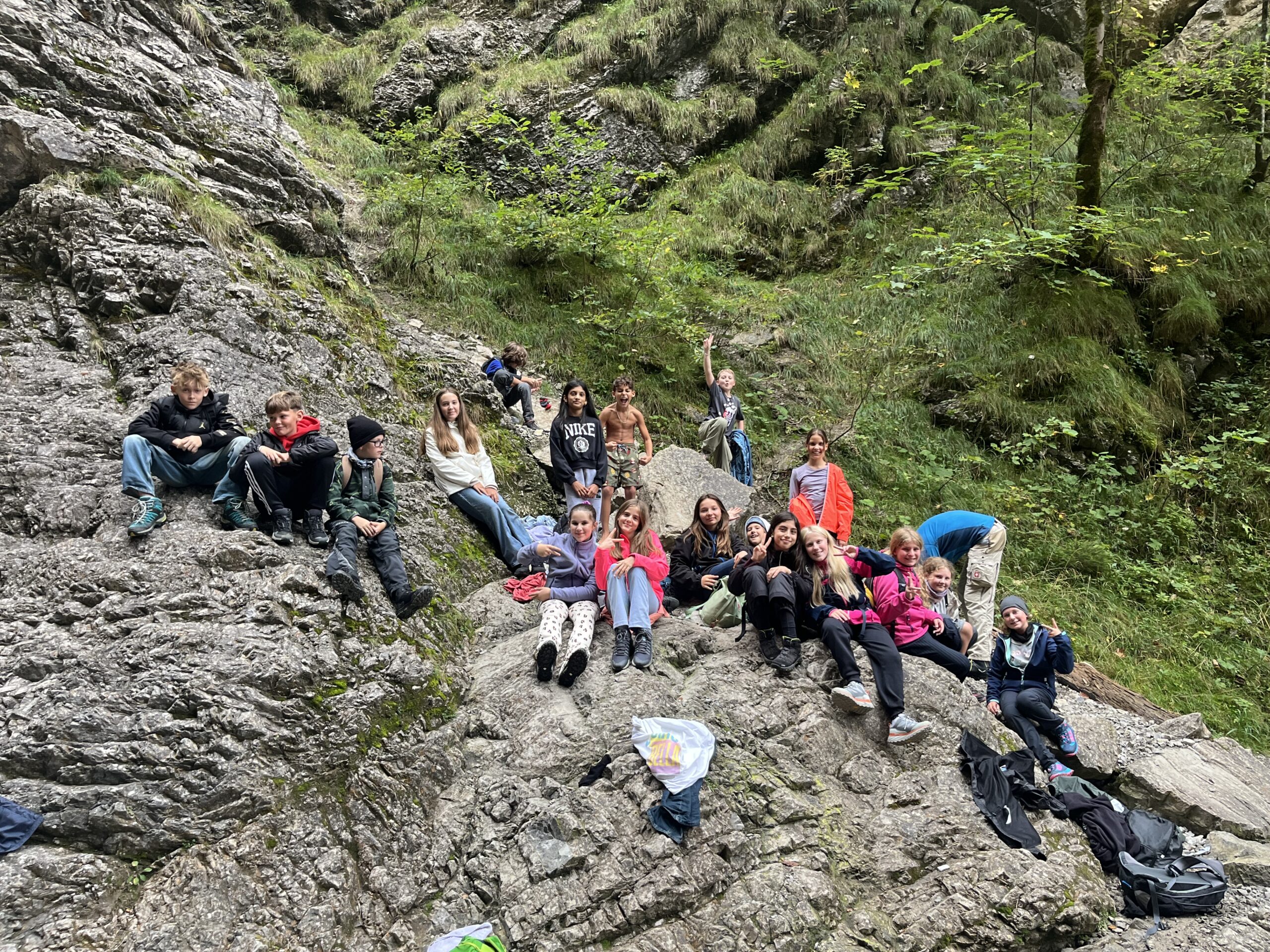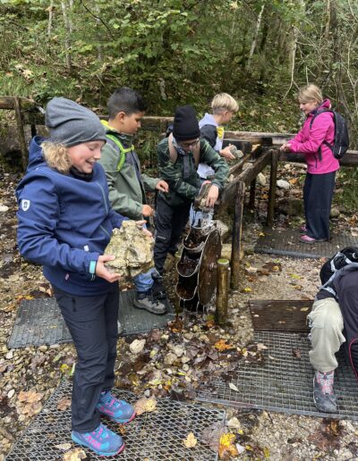Der nächste Tag sollte positive Gewissheit bringen. Zwei schwere „Prüfungen“, die ein hohes Maß an Selbstdisziplin und an Kooperationsbereitschaft von der Klasse verlangten, wurden schier mühelos bewältigt. Als Schmankerl gab es am Nachmittag eine abenteuerliche Bachbettwanderung, den Ellesbach hinauf zum Schleierfall. Dass dabei der Regen zunehmend kräftiger wurde, störte niemanden, als es den Wurzelpfad fröhlich grüppchenweise bergab ging. Was ist denn an einem Hochseilgarten noch besonders? Fast jede und jeder aus den Klassen haben bereits einen bewältigt. In der JUBI ist er aber anders aufgebaut: Nur mit gegenseitigem Helfen, Mut machen und Mitsichern geht es den Flying Fox hinunter. Zuvor wartet jedoch der Sprung im freien Fall von der kleinen Plattform hinunter, bis man spürbar an dem am Kombigurt befestigten Seil hängt und hinuntersaust. Das erfordert Überwindung und das Verlassen der individuellen Komfortzone. Durch freundliche Motivationszurufe lassen viele ihre Bedenken fallen und wagen den „Sprung ins Nichts“. Gemeinsam wird nach dem Auspendeln die Leiter angestellt und die Schüler helfen sich gegenseitig, die Sicherungsseile zu lösen und dem gerade hinuntergesausten Klassenkamerad die Leiter hinunter. Auch wenn man die ca. 6m hohe wacklige Riesenleiter des Pamper Pole hinaufklettern will, braucht es die Gruppe, die die Leiter fixiert. Es müssen alle auch gleichmäßig ziehen, um den Kletterer und die Kletterin zu nach oben zu sichern. Mutige trauen sich auf die schwankende Plattform und springen ins Kletterseil, das auch zusätzlich von einem Trainer gesichert wird. Bei manchen hilft Anfeuern, bei anderen Teilnehmern ein „beruhigendes Gemurmel“. Herausfordernd war es für alle, auch für den Lehrer, der sich seinen Schülern völlig anvertrauen musste, um wieder sicher auf dem Boden zu landen.