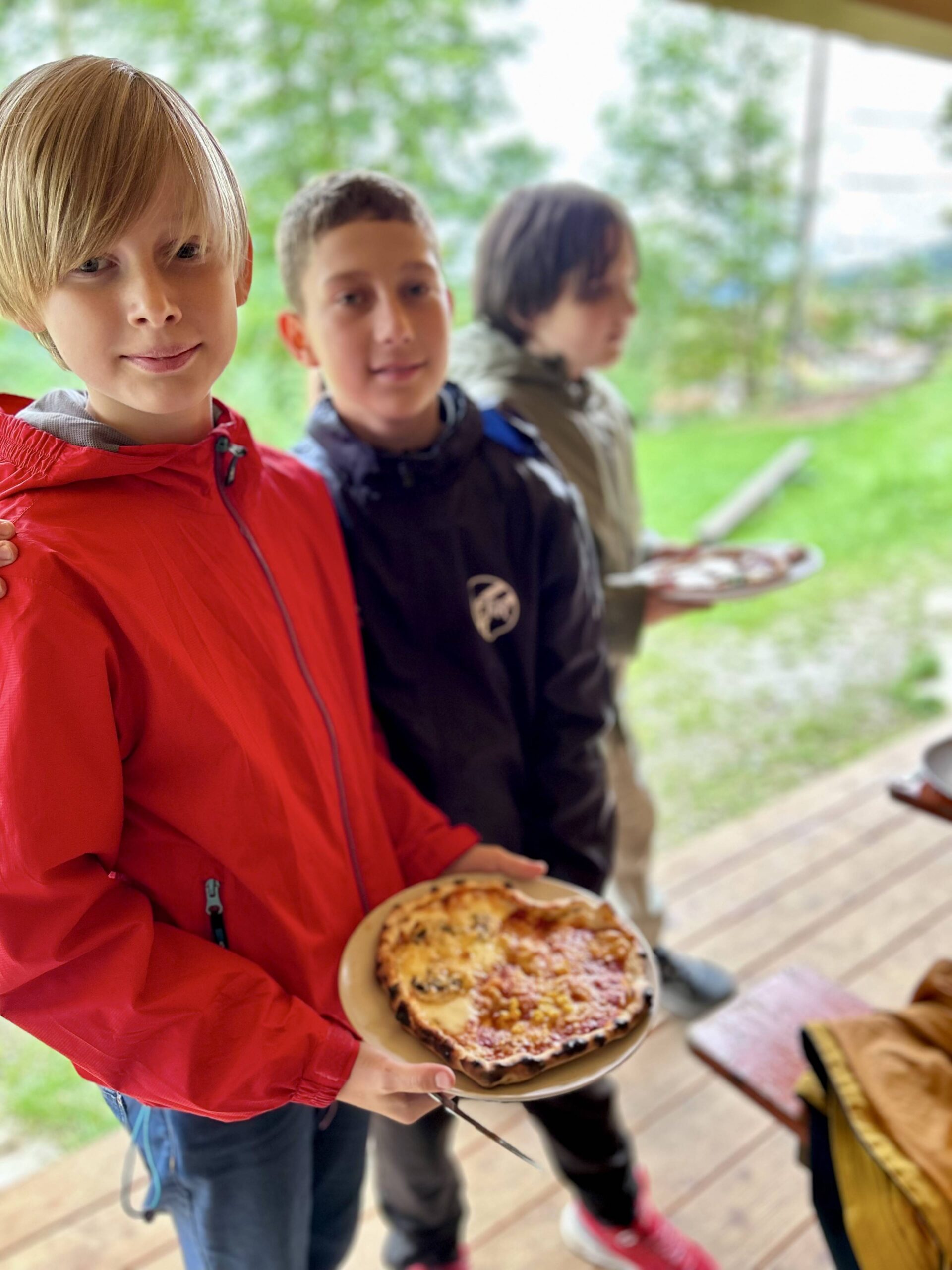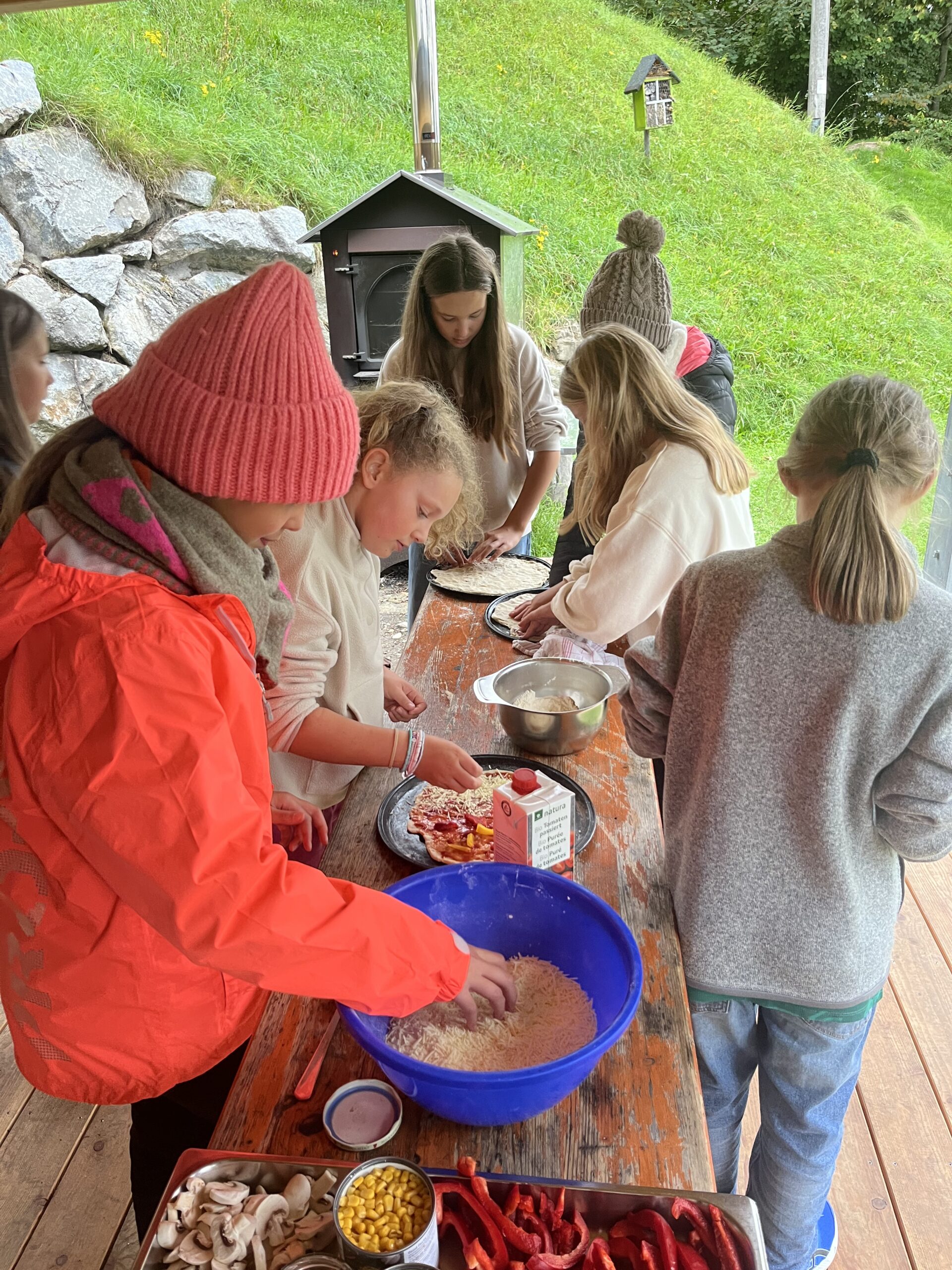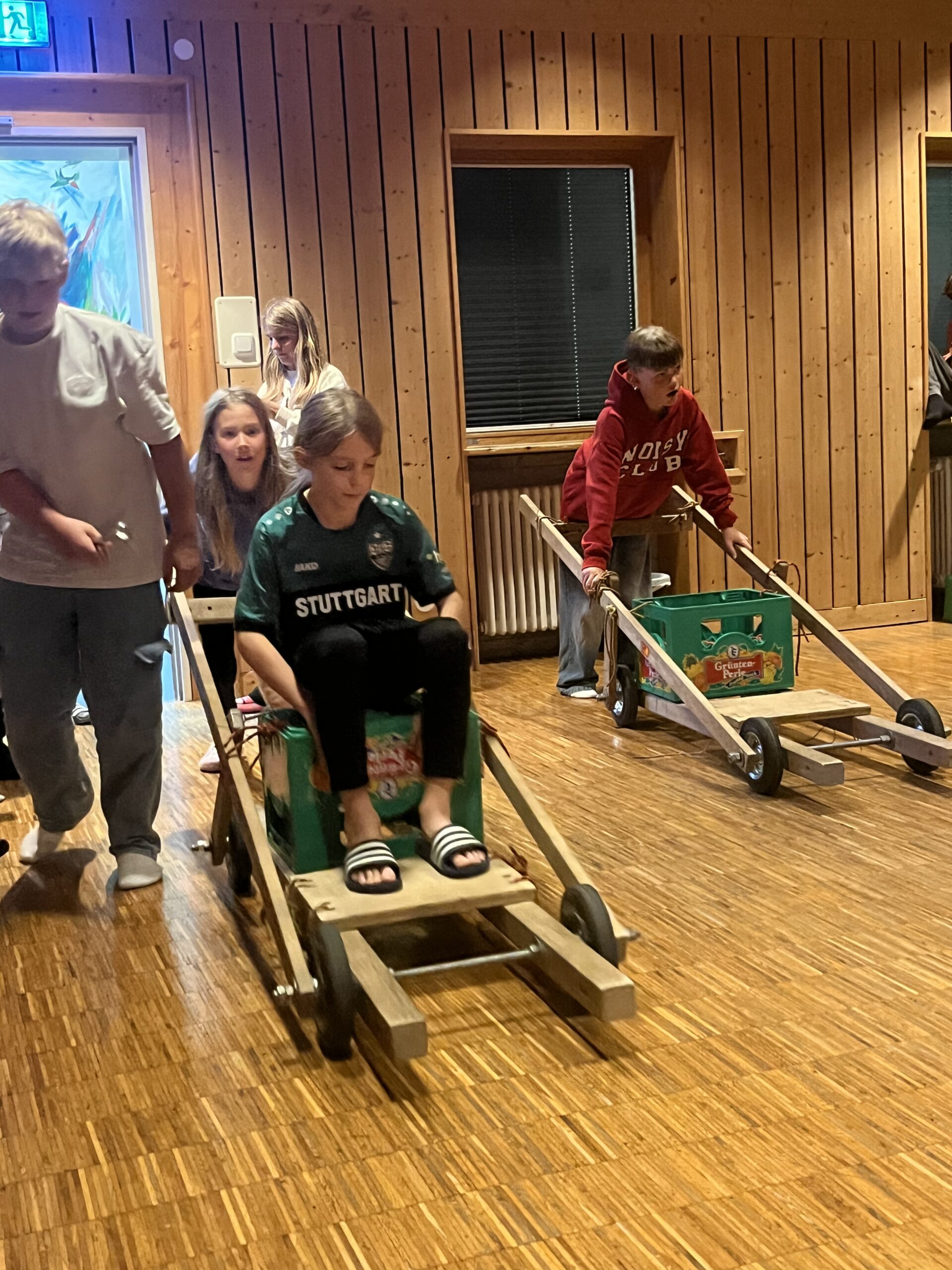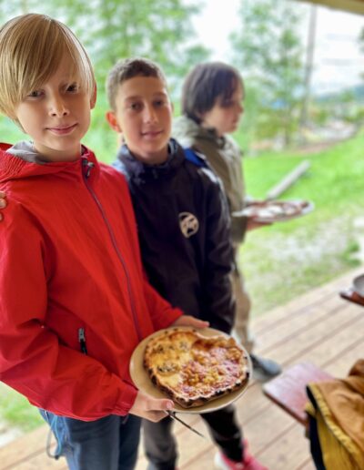 Heute dauert es noch gefühlt ewig, bis alle im Kreis stehen und still sein können. Aber auch daraus wird eine Challenge gemacht. Wenn es der Klasse gelingt, nach ca. 20 sec. im Kreis still zu sein, bekommt sie einen Punkt, wenn die Teamer mehr Punkte gewinnen, putzen Sie am Abend die beiden Klassentische. Ergebnis an diesen Tag: Unentschieden. Am Abend die erste ausgiebige warme Mahlzeit mit drei verschiedenen Sorten von Tortellini und jeweils verschiedenen Soßen, zusätzlich Spinatgnocchi, ein exquisites, variationsreiches Salatbüffet, unter anderem mit bayrischem Semmelknödelsalat und als Dessert Quarkspeise mit versunkenen Kirschen und Schokoraspeln. Hat jemand nach Fleisch gefragt? Nein! Es wird Nacht, der Boulderraum und die Tischtennisplatte im Mehrzweckraum sind verwaist. Auch die Balkone sind jetzt leer und still. Alle bereiten sich auf die Bettruhe vor, mehr oder weniger intensiv. Und überraschenderweise gibt es kaum Heimwehschmerz und bis auf wenige Ausnahmen bleibt dies auch so. Heute nur ein paar gequetschte Finger und eine dicke Beule um kurz vor Mitternacht.