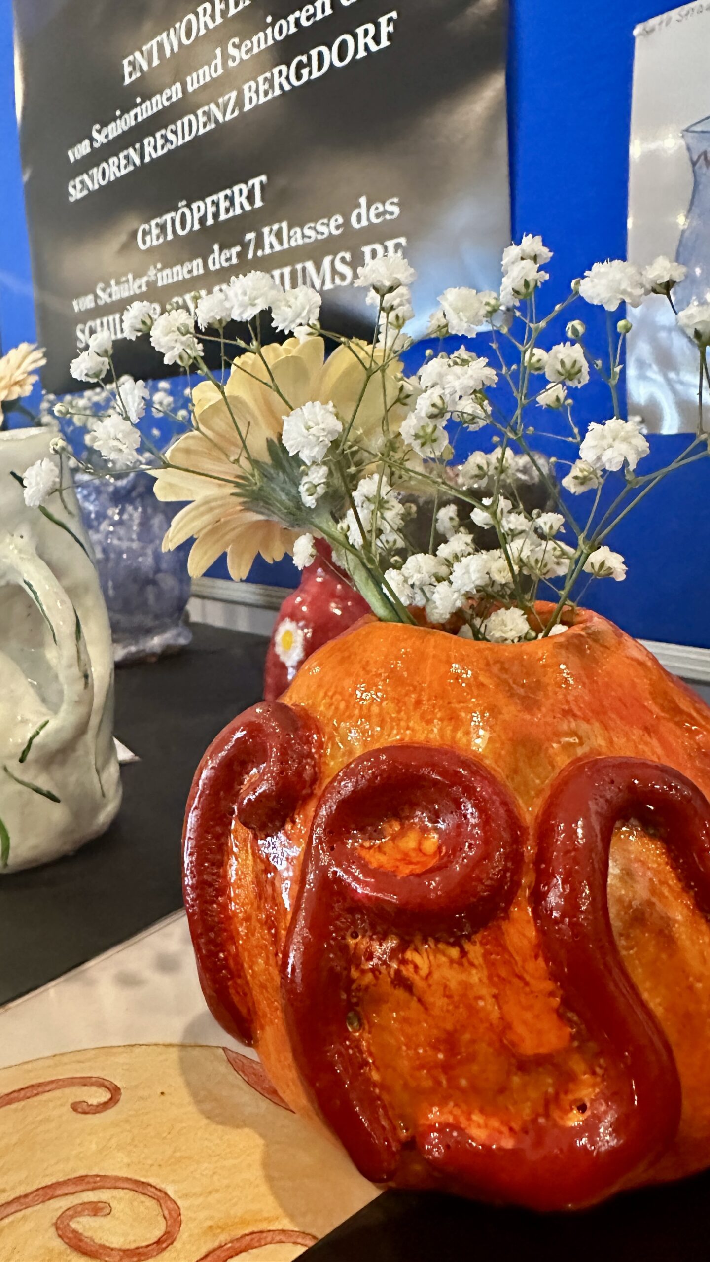 In den Sommerferien startete am Schiller-Gymnasium ein ganz besonderes Kunstprojekt, das Schülerinnen und Schüler mit Seniorinnen und Senioren auf berührende Weise verbunden hat: „Vasen voller Leben“. Initiiert wurde das Projekt von unserer Kunstpädagogin Frau Schissler-Schein, die das Vorhaben zunächst im Seniorenheim Bergdorf in Büchenbronn vorstellte. Dort gestalteten die Bewohnerinnen und Bewohner mit viel Freude und Kreativität ganz individuelle Vasenentwürfe – frei nach ihrem eigenen Geschmack. Es entstanden Arbeiten voller Persönlichkeit, Fantasie und Farbenfreude. Viele dieser Ideen wirkten wie Unikate, die es so nur im Kopf und Herzen ihrer Gestalterinnen und Gestalter geben kann. Diese Entwürfe wurden anschließend an die Schülerinnen und Schüler der 7. Klassen des Schiller-Gymnasiums weitergegeben. Mit großer Konzentration und viel Respekt vor den ursprünglichen Ideen setzten die Jugendlichen die Vorlagen um. Sie formten die Vasen Schritt für Schritt aus Ton und glasierten sie schließlich mit sorgfältig ausgewählten Farben. Da das Projekt mehrere Arbeitsschritte umfasste und sich über einen längeren Zeitraum erstreckte, entstand zwischendurch eine weitere schöne Verbindung: Die Schülerinnen und Schüler schrieben Briefe an die Seniorinnen und Senioren, teilweise ergänzt durch Fotos der entstehenden Vasen und persönliche Porträts. Diese Post sorgte im Seniorenheim für große Freude und tiefe Rührung – aus einem Kunstauftrag wurde eine echte Begegnung.